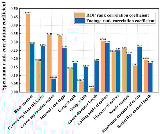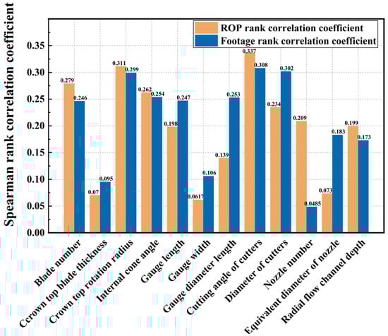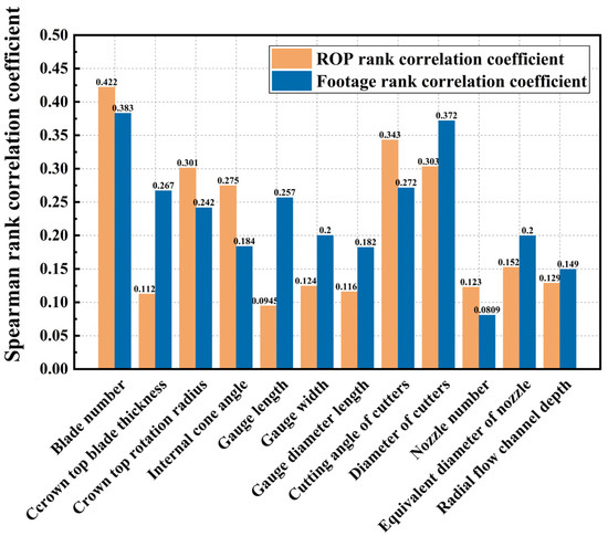 The Spearman rank correlation coefficient method is a statistical analysis tool for nonlinear parameters. The correlation between random values of variables is studied, and the influence degree of each component on the model is identified by comparing the order change in the objective function values produced by the order change in a given factor in each sample set. The advantage is that it is not constrained by factor values and simply needs to analyze changes in the ranking position of the factor sample set and objective function value. It is a nonparametric (distribution-independent) test method for determining the strength of a variable’s association with another variable. It can better match the sensitivity analysis of the bit structure characteristics to the ROP and footage in this issue when combined with the analytical results of the bit structure characteristics [27,28].