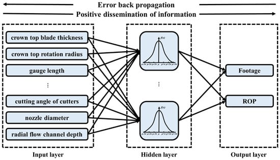 Many scholars have studied the prediction and optimization of the ROP through neural networks based on the data-driven model in the field of artificial intelligence, and with the development of computer technology such as big data and machine learning, among which the BP neural network algorithm is widely used because of its high flexibility. The BP (back propagation) neural network technique, also known as error back propagation, is divided into two processes: signal forward propagation and error back propagation adjustment. The input signal is conveyed to the output layer by layer-by-layer calculation of the hidden layer in forward propagation, and the neurons in each layer are only influenced by the neurons in the preceding layer. If the expected output is received by the output layer, the learning algorithm ends; if the expected output is not received, the error change value of the output layer is calculated, and the error signal is transmitted back along the connection path through the network to modify the weights of neurons in each layer until the expected goal is achieved.