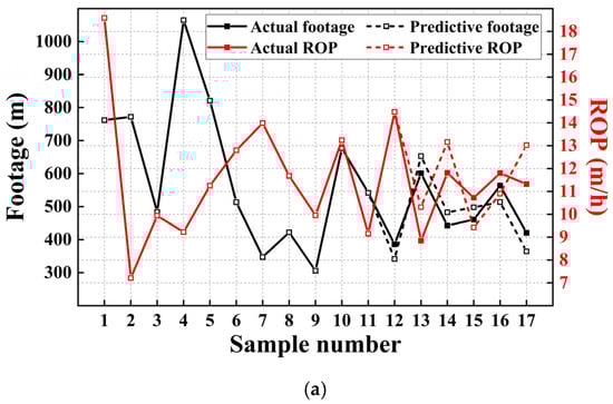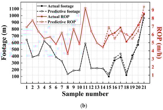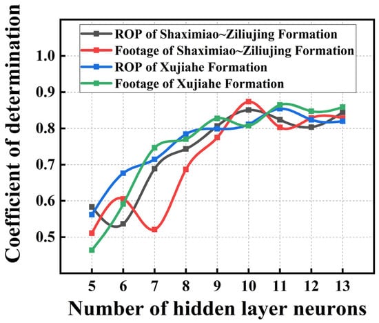 The determination coefficient has a range of [0, 1], and the closer it is to 1, the better the model’s performance. On the other side, the closer it is to 0, the lower the model’s performance. As illustrated in Figure 5, the optimal number of hidden layer units in the Shaximiao Formation–Ziliujing Formation ROP prediction model is ten, and the optimal number of hidden layer units in the Xujiahe Formation ROP prediction model is eleven. The goodness of fit is greater than 85%, and under the selected number of hidden layers, the predicted demand can be satisfied. The model’s accuracy is outstanding.