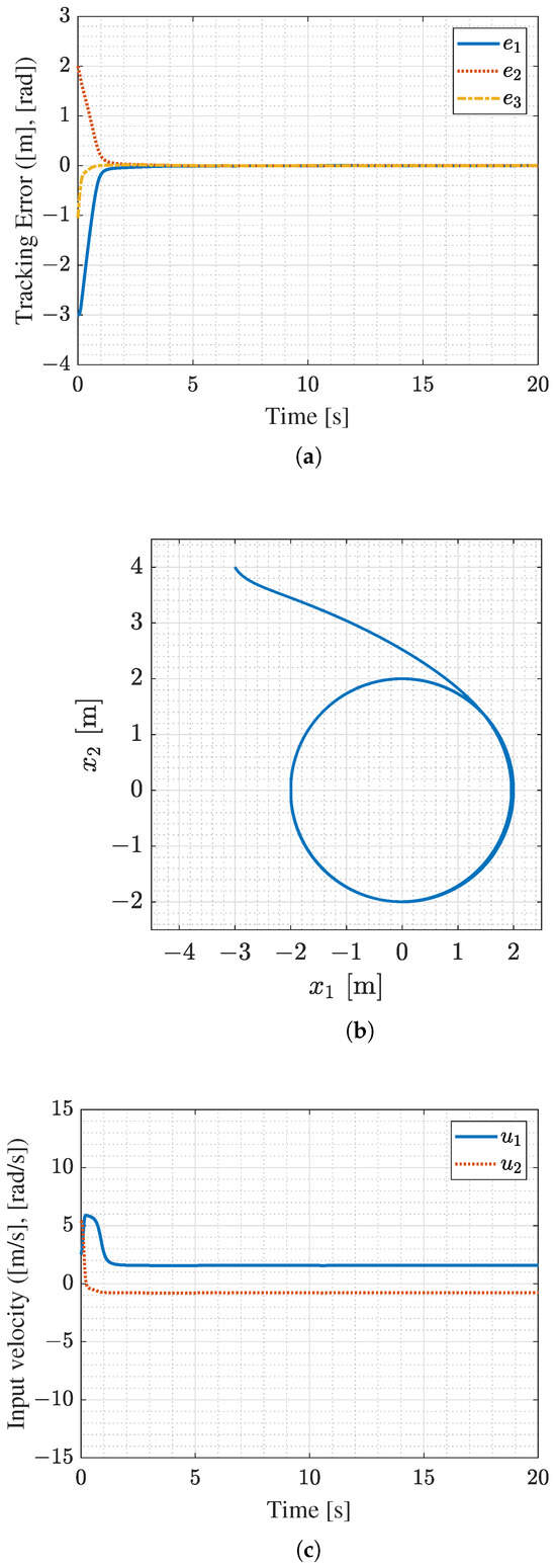 Simulations results with the proposed controller (64) are illustrated in Figure 2. We can confirm that the tracking error e converges to 0 quickly, and hence, trajectory tracking is achieved by Figure 2a–c.