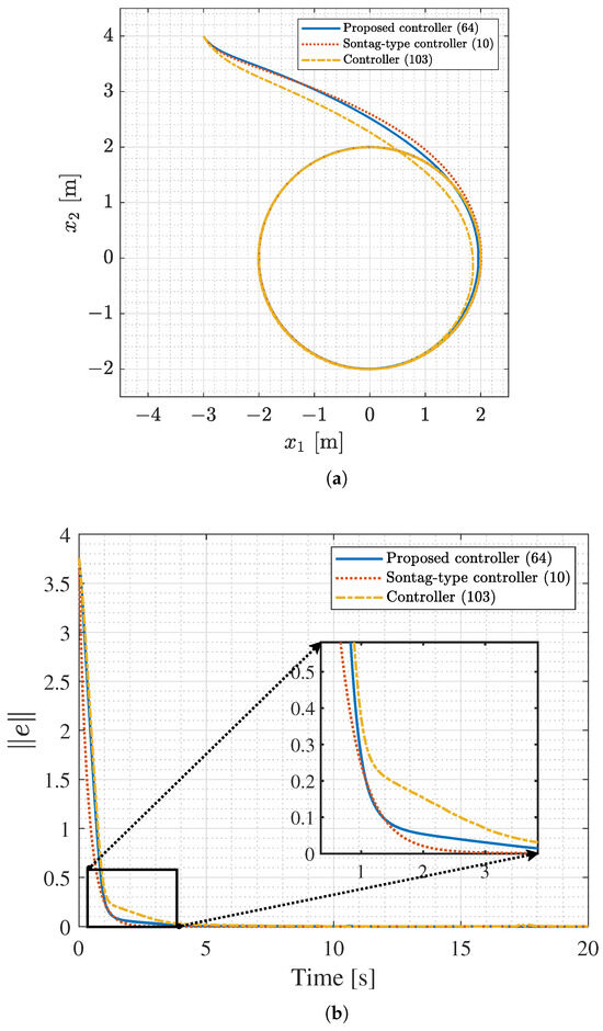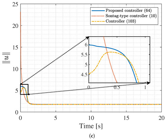 For comparison, we also ran computer simulations with the other tracking controllers mentioned in Section 6.3. The comparative simulation results are summarized in Figure 3. We can confirm that the controllers (10) and (103) achieve trajectory tracking by Figure 3a. According to Figure 3c, we can also see that the Sontag-type controller (10) violates the convex input constraint (85) for (i.e., the original norm constraint (82) for u) while the proposed controller satisfies it. Although the (unconstrained) Sontag-type controller (10) achieves the best performance in terms of tracking error convergence, the proposed controller (64) also achieves good performance under the input constraint (see Figure 3b). To improve the convergence speed of the proposed controller in a small neighborhood of , it is important to design the function C in (64) more carefully.
