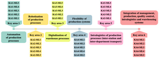 The area of business management systems integration (KA6) showed the lowest correlation rate and 75% of those surveyed stated a lack of interest in the complex integration of factory management systems in favor of investment in production automation. Most respondents, around 70%, delayed the pursuit of flexibility (KA4) in their production systems to a later period. Only 32% of the respondents prioritized intralogistics (KA5) due to the abandonment of the development of manufacturing flexibility with mobile robots.