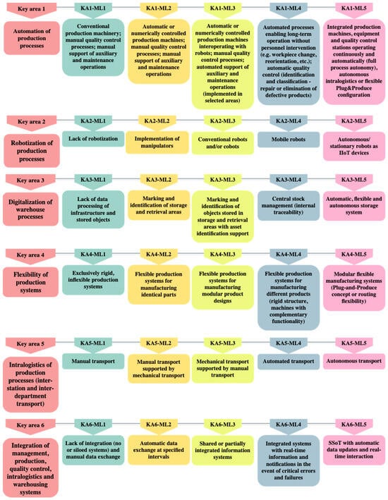 Figure 6). These levels represent increasing degrees of advancement while considering the general trends and assumptions regarding the modern trends of automation and the concept of the Factory of the Future.