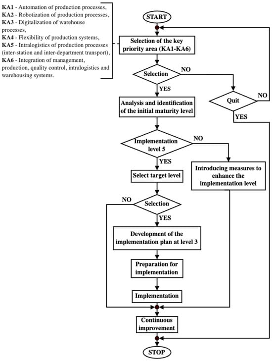 Figure 5 shows the algorithm for evaluating the defined maturity levels across key areas. Reaching the fifth level of implementation makes moving to the next level of maturity achievable.
