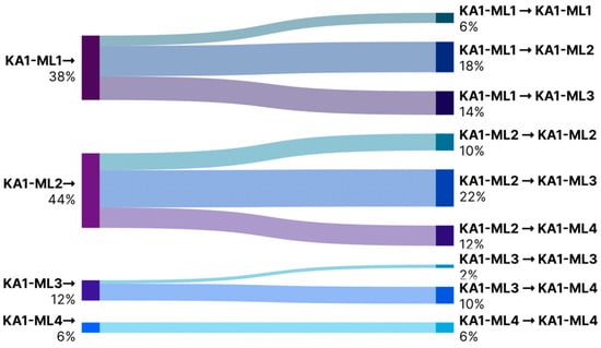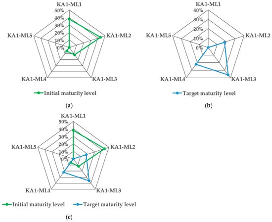 In total, 38% of enterprises in the survey are at the KA1-ML1 maturity level, using conventional machinery. A total of 6% of enterprises plan to maintain the status quo due to the craft-based nature of operations and the need for more potential to automate production processes. Eighteen percent of respondents plan to use automated or numerically controlled machines at the KA1-ML2 level without implementing technological process robotization. Moreover, 14% of respondents at the KA1-ML1 level plan to implement automated machines or production lines operated by industrial robots.
