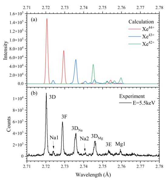 Figure 1a illustrates the calculated spectra for Xe ions from 42+ to 44+. For comparison, plasma parameters in this simulation were set according to experimental conditions, with the electron-beam energy of 5.5 keV and the electron density of 1.6 × 1012 cm−3. The intensity results from each individual charge state were normalized to the brightest lines. In the simulated spectra, all transition lines were assumed to have the Gaussian profile with the linewidth of 0.8 mÅ, which corresponds to the experimental resolution. The theoretical wavelengths and emission intensities under the given plasma parameters are also presented in Table 2. The discrepancies between theoretical and experimental wavelengths for all lines in three ions are within 0.04%.