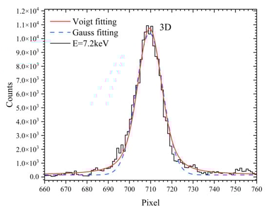 To enhance the reliability of intensity measurements, the two-dimensional pixel count arrays obtained through CCD accumulation were reconstructed by photonization and filtered by count threshold using a data processing program. This program can significantly improve the signal-to-noise ratio of the spectra, thus it has been widely employed in X-ray spectroscopy measurements in our laboratory [71,72]. In the spectral processing for these experiments, count thresholds were set according to the principle of less intensity loss and baseline normalization. Figure 1b illustrates the processed X-ray spectrum obtained with the nominal electron-beam energy of 5.5 keV, which has the longest data accumulation time.