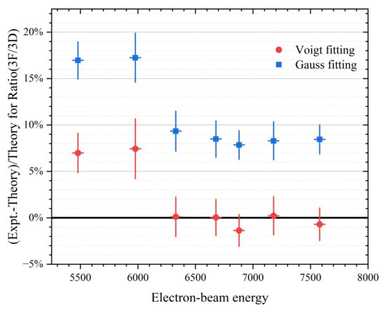 Relative differences between experimental and theoretical line-intensity ratios of 3F/3D fitted with Gaussian (blue square) and Voigt (red circle) profiles.