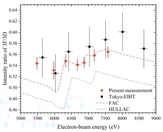 Figure 4 illustrates the variation of the experimental 3F/3D line-intensity ratio with electron-beam energy for all conditions, accompanied by corresponding error bars, with an average relative uncertainty of 2.1%. Total uncertainty contains statistical errors from fitting profile and reproducibility at the same energy conditions, and systematic error from threshold selection. Figure 4 also shows the theoretical curves obtained from CRM simulations based on FAC, which depicts the variation of 3F/3D line-intensity ratio with electron energy in the range 5000–8000 eV. The electron density was fixed at 1.6 × 1012 cm−3, because the impact of various electron density on the line-intensity ratios can be neglected according to another simulation with different density. The theoretical predictions of 3F/3D intensity ratio exhibit good agreement with the experimental results for electron-beam energy higher than approximately 6000 eV. Not only do they share the same trend, but the theoretical ratios also fall within the experimental error bars, with relative deviations less than 1.4%. For the results at about 6.0 keV and 5.5 keV, theoretical ratios are still lower than experimental measurements, with relative deviations of 7.0% and 7.4%, respectively. In previous study from Ref. [16], there is a larger significant discrepancy (≈13.7%) of 3F/3D between measured spectrum from Tokyo-EBIT and theoretical predictions calculated by the HULLAC code. These results are also presented in Figure 4. Our measured ratios fall within the error bars of their measured values and exhibit significantly better agreement with our calculated values, even for the results in the low-energy region. Their theoretical curves from HULLAC exhibit similar jagged changing patterns as the FAC results but differ in positions of peaks and valleys, averaging about 5% lower overall. This reflects the differences between these two theoretical methods in describing atomic structure and population equilibrium.