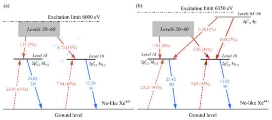 Grotrian diagram of the main levels concerned about 3D and 3F transitions in Ne-like Xe44+. The italic numbers are the indexes of levels in FAC calculations, especially level 16 for 3F and level 18 for 3D. The gray rectangle refers to a series of energy levels 20–60 below 6000 eV. Levels 63–66 are from configuration 2p51/24p. The fluxes (in cm−3·s−1) of feeding paths (red arrows) and radiative decay paths (blue arrows) are shown in the electron-beam energy of 6000 eV (a) and 6350 eV (b), with the excitation limit on it respectively. The branching ratios of feeding paths for level 18 and level 16 are shown in parentheses behind the flux values, including electron-impact excitation (EIE, short dot arrows) and cascade transition (solid arrows).