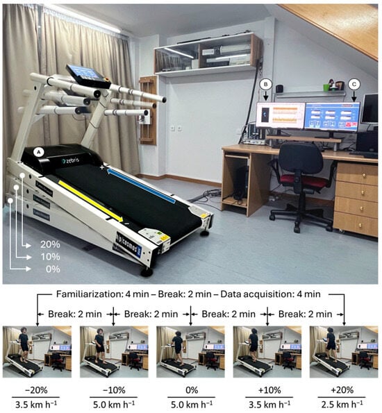 Experimental setup utilized in the research protocol: The treadmill’s surface (A) configured for level walking (0%) with 5.0 km h−1, uphill walking on +10% and +20% slopes with 3.5 km h−1, and 2.5 km h−1, respectively, and downhill walking on −10% and −20% slopes with 5.0 km h−1 and 3.5 km h−1, respectively. Display on the screen of the data transferred to the desktop (B) and the software provided by the manufacturer (C) for remote control of the treadmill.
