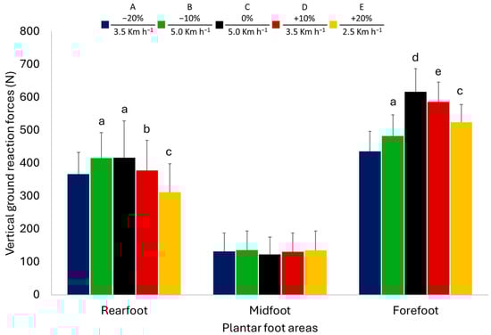 Maximum vertical ground reaction forces exerted on rearfoot, midfoot and forefoot during uphill (+) and downhill (−) walking at speeds determined by Tobler’s hiking function. a Significant difference (SD) compared to A walking condition (p ≤ 0.001); b SD compared to B and C walking condition (p ≤ 0.001); c SD compared to A, B, C and D walking condition (p ≤ 0.001); d SD compared to A and B walking condition (p ≤ 0.001); e SD compared to A, B and C walking condition (p ≤ 0.001).