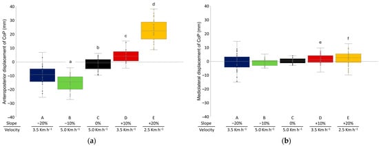Box plots for center of pressure (COP) positions in (a) anteroposterior and (b) mediolateral directions during uphill (+) and downhill (−) walking at speeds determined by Tobler’s hiking function. a Significant difference (SD) compared to A walking condition (p < 0.001); b SD compared to A and B walking condition (p < 0.001); c SD compared to A, B and C walking condition (p < 0.001); d SD compared to A, B, C and D walking condition (p < 0.001); e SD compared to B walking condition (p < 0.05); f SD compared to B (p < 0.01) and C (p < 0.05) walking condition.
