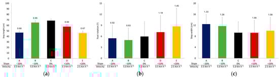 Mean and standard deviation (error bars) of (a) step length, (b) foot rotation, and (c) step width under different walking conditions. The change in each spatial parameter for the uphill and downhill walking conditions is presented as a multiple of the corresponding mean spatial parameter in the C walking condition.