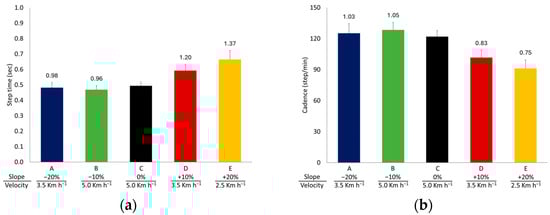 Mean and standard deviation (error bars) of (a) step time and (b) cadence under different walking conditions. The change in each temporal parameter for the uphill and downhill walking conditions is presented as a multiple of the corresponding mean temporal parameter in the C walking condition.