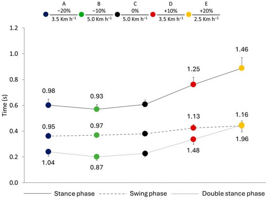 Mean and standard deviation (error bars) of stance, swing, and double-stance phase duration under different walking conditions. The change in the duration of each gait phase for the uphill and downhill walking conditions is presented as a multiple of the corresponding mean gait phase duration in the C walking condition.