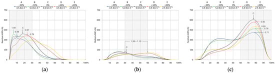 Statistical analysis revealed significant differences between walking conditions for step length (F = 752.933, p ≤ 0.001, partial η2 = 0.960). Post-hoc comparisons indicated that, compared to level walking, step length decreased as uphill and downhill walking became more demanding. Significant differences between walking conditions were found for step width (F = 57.802, p ≤ 0.001, partial η2 = 0.651). Compared to level walking, step width increased progressively during downhill walking, while only minor and non-significant changes were observed during uphill walking. There were significant differences in foot rotation across the different walking conditions (F = 33.199, p ≤ 0.001, partial η2 = 0.517). Post-hoc analysis revealed a significant increase in foot rotation during uphill walking compared to level walking. Additionally, foot rotation was lower in downhill walking, with significant differences observed only when comparing level walking to walking at a −10% slope and a speed of 5.0 km h−1 (refer to Table 2 for pairwise comparisons).