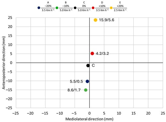 Our findings revealed an anterior shift of the COP during uphill walking compared to level walking, with this shift becoming more pronounced as the slope increased. Conversely, during downhill walking, the COP shifted backward compared to level walking, with this backward shift being more prominent at a −10% slope. Furthermore, the mediolateral shift of COP increased during uphill and downhill walking compared to level walking, and this shift tended to increase, although not always significantly, as the slope became steeper (Figure 8). These findings are consistent with previously reported data that have shown a greater shift in the anteroposterior direction and mediolateral excursions of the COP at uphill inclinations of 15 and 25 degrees [65].