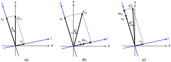 The estimated position errors corresponding to the variation in the - axes extended back EMF are illustrated in Figure 2. Note that , , , and represent the estimated rotor position error and extended EMF, caused by the - and -axes extended back EMF errors ), respectively. As shown in Figure 2a, in the case of a constant value of the - and -axes extended back EMF, and , the estimated extended EMF aligns with the -axis of the synchronous reference frame. In Figure 2b,c, on the other hand, when errors occur in the - axes extended back EMF resulting from an inductance variation, it leads to the generation of estimated rotor position errors. Usually, the -axis extended back EMF component exhibits a significantly greater magnitude compared to the -axis component (); therefore, the variation in the -axis extended back EMF component significantly influences the speed estimation error compared to the -axis component [14]. Consequently, is significantly larger than compared to , when the magnitudes of and are the same value, as shown in Figure 2b,c.