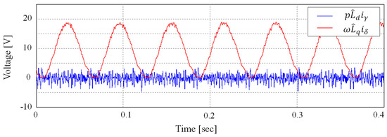 In addition, to compare the magnitude of the two terms constituting the -axis back EMF variation in Equation (4), a simulation result of the comparison of and under the condition of periodic load torque is represented in Figure 3. The term including the -axis inductance is the main component in estimation; hence, it can be expressed as . Consequently, since the dominant factor affecting position error estimation is , compensating fluctuations in the -axis inductance, being the principal parameter influenced by magnetic saturation, can effectively enhance both the position error and speed ripple.