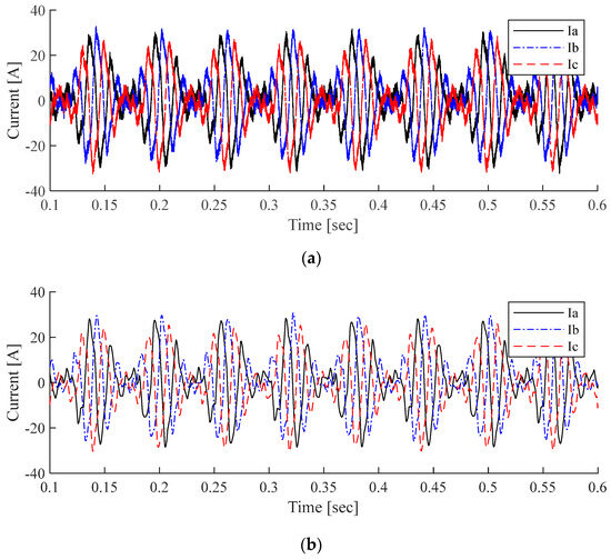 Figure 4 represents the simulation results of the raw signal of the three-phase current sensor and the denoised signal after applying the wavelet filter, respectively, under the condition of periodic load torque. As shown in Figure 4a, the measured signal from the current sensors contains noise, including measurement noise and power switching noise, in the original signal. However, by applying wavelet transformation, small wavelet coefficients are classified as noise and selectively removed, resulting in minimal distortion or delay in the signal, thus not affecting the quality of the original signal. Finally, after applying a threshold to the wavelet coefficients and using wavelet inverse transformation, the restored original data are shown in Figure 4b.