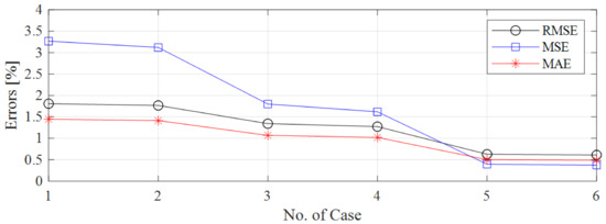 Table 2 presents a comparison of the RMSE, mean squared error (MSE), mean absolute error (MAE), and the linear regression index (R and R2) of the -axis inductance, estimated by wavelet-GMDH based learning for each case of input variables and regression layers using MATLAB R2023a. Furthermore, the comparisons of the evaluation metrics (RMSE, MSE, MAE) for all cases are shown in Figure 5. As a result of the comparison, it is observed that the evaluation metrics results are improved as the number of input variables and regression layers increase. Based on the analysis results, the optimal regression combination chosen consisted of eight input variables with five layers (Case 5), satisfying the training performance criteria (RMS error < 1, linear regression index (R) > 0.99), from Equations (20) and (21). Additionally, both the MSE and MAE were observed to be less than 0.6%, and the coefficient of determination was close to 1, indicating the good performance of the regression model. To further minimize errors, the number of regression layers can be increased to seven or more, but it leads to an increase in the processor load due to the complex computation.