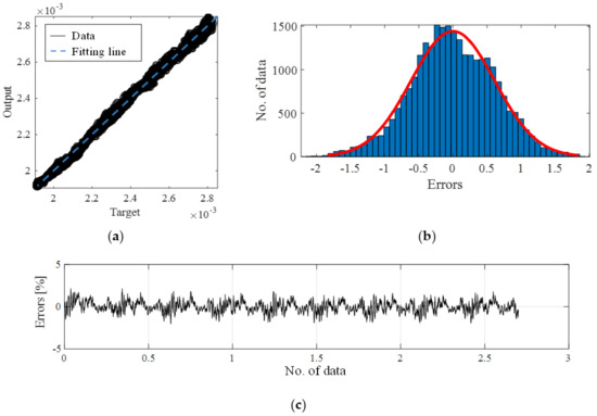 Figure 6 presents the linear regression results, histogram of the estimation errors, and estimation errors of the wavelet-GMDH simulation for case 5 comprising eight input variables with five layers. As shown in Figure 6a, the slope of the fitting line in the linear regression is close to 1. In Figure 6b, analysis of the error histogram indicates that the error values exhibit characteristics of a normal distribution based on a zero-mean, indicating the robustness of the trained model across the dataset. Furthermore, the estimation errors, directly related to the RMSE, MSE, and MAE, appear relatively uniform, with the mean value remaining below 1%, as shown in Figure 6c.