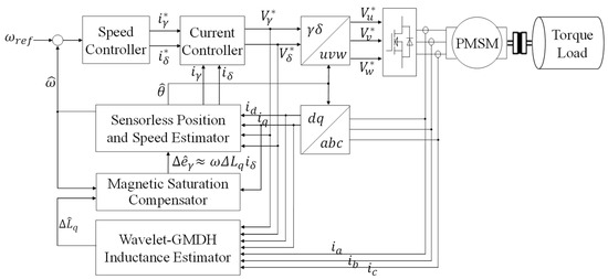 Figure 7 represents the block diagram of the entire control system for the PMSM sensorless control, including the proposed wavelet-GMDH based magnetic saturation compensation control. Through an optimized polynomial expression-based numerical model utilizing the GMDH algorithm, real-time calculation of the inductance is achieved from eight input variables, including phase currents, voltage references, etc. In the magnetic saturation compensation block, the variation in the estimated inductance is utilized to compute the extended back EMF fluctuation. Subsequently, the back EMF fluctuation is fed back to the sensorless position controller to compensate for the inductance variation in real time and mitigate the speed ripple.