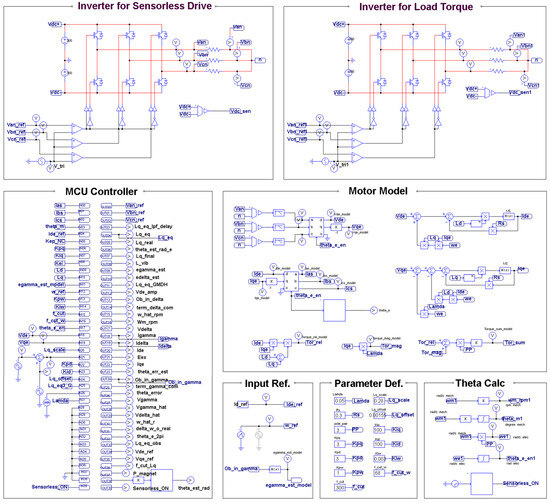 Figure 8 represents the sensorless control system modeled for the application of a magnetic saturation and compensation control system in a simulation. It is implemented as a dual motor system and consists of a sensorless motor drive and a load motor system to simulate periodic loads. The electric motor model provided by the PSIM v11.1 inherently does not account for magnetic saturation. Therefore, a detailed motor model based on mathematical models and motor parameters was implemented. Furthermore, to create an environment similar to the actual system for the wavelet-GMDH based magnetic saturation compensation algorithm, a microcontroller unit (MCU) controller was modeled through co-simulation with a DLL file based on C language programming.