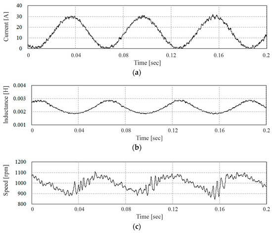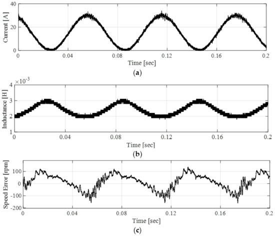 Figure 10 shows the simulation results of the torque compensation current, inductance, and speed performed by simulating the equivalent load conditions as the experimental results. When the -axis current is controlled with a peak-to-peak amplitude of 30 A in Figure 10a, the actual inductance fluctuates, as depicted in Figure 10b. Conducting control without compensating for the inductance variations due to magnetic saturation leads to significant ripple in the estimated speed, as shown in Figure 10c.
