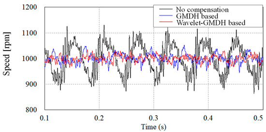 Figure 11 represents the comparison of the estimated speed between no compensation, GMDH based compensation, and wavelet-GMDH based compensation in the time domain when operating at a constant speed of 1000 rpm under conditions of magnetic saturation. It shows the results obtained when basic sensorless control is performed without compensation, as well as when magnetic saturation compensation control is applied based on the GMDH algorithm and wavelet-GMDH algorithm, respectively. The estimated speed error displays peak-to-peak ripples of over ±100 rpm when compensation control is not applied. On the other hand, when GMDH based compensation is applied, the ripple is reduced by half, and when wavelet-GMDH based compensation is applied, it is reduced to less than ±30 rpm.
