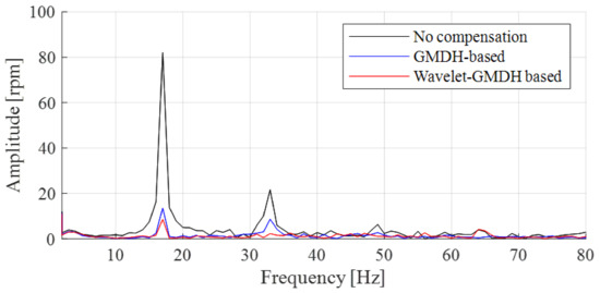 Furthermore, in the frequency domain comparison results, as depicted in Figure 12, prior to the application of compensation control, the amplitude of the first harmonic component, which has the greatest influence on the speed ripple, was significantly large at about 80 rpm. In the case of GMDH, the amplitude of the first harmonic of the speed reduced to 1/7th compared to the uncompensated condition. On the other hand, after applying the proposed compensation control, it was observed that the amplitude decreased to less than 10 rpm, representing a significant improvement over GMDH. Particularly, as the frequency increases, the amplitudes of the second and third harmonic frequency components are nearly eliminated.