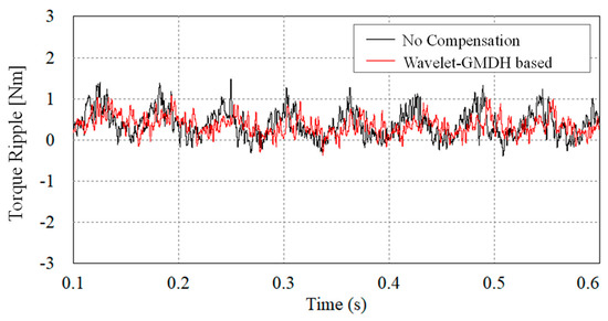 Comparison of torque ripple between no compensation and wavelet-GMDH based compensation.