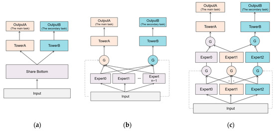 Most commonly used MTL structures. (a) Description of the structure of Shared-Bottom; (b) Description of the structure of MMoE; (c) Description of the structure of PLE.