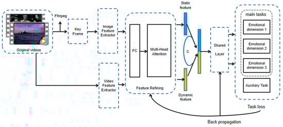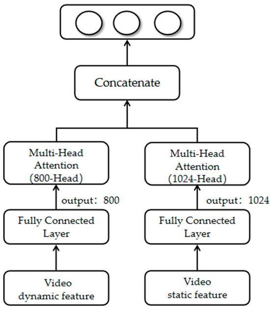 The feature refinement layer accepts the output of the feature extraction layer, which has video features containing dynamic features and image features containing static features; the features have different semantics and belong to different spaces. We use the feature refinement module to represent video and image features and mine their unique feature information. A multi-headed attention mechanism uses attention weight calculation to control feature flow and integration. Attention mechanism-based models have been shown to universally enhance the effectiveness of features [42,43,44,45,46,47]. We use a multi-headed mechanism [48], which realizes learning features from different dimensional semantic representation subspaces, improving fine-grained affective prediction accuracy.