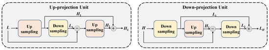 Since the traditional back-projection process is sensitive to parameter choices, such as the number of iterations, t, filters, , and the blur operator, , Haris et al. [] proposed an end-to-end trainable deep back-projection network (DBPN) based on the original algorithm. DBPN consists of up-projection and downprojection units, as shown in Figure 2. The up-projection unit takes the previously computed LR feature map, L, as input and maps it to an HR map, . Then, it is mapped back to the LR map (“back-project”). The residual between the observed LR map, L, and the reconstructed map, , is mapped to the HR again, which produces a new map: . The final output of the up-projection unit, , is the sum of the two intermediate HR maps, and .