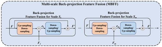 The multiscale back-projection feature fusion mechanism (MBFF) continuously superimposes multiple scale feature maps to perform scale transformation and feedback errors iteratively. As shown in Figure 3, the input feature is F, and the features of different scales are fused with the input from the back-projection feature fusion block. is the feature map for the scale with . The process for one back-projection feature fusion is formally formulated as follows:
