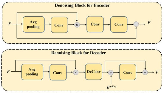 Details of the denoising block for the encoder and decoder. The top part illustrates the denoising block in each encoder. The figure below is the denoising block used during decoding.