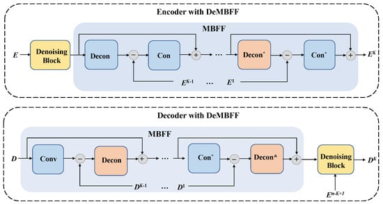 The decoder with DeMBFF is defined very similarly, but now its task is to upsample and refine features to generate high-quality output. Each encoder consists of several MBFFs from the former layers and one denoising block. In addition, the feature of the encoder is passed via a skip connection. The process is illustrated in Figure 5, which is formulated as follows: