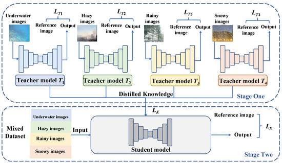 In order to make the model suitable for multiple types of degradation images, we propose a novel multiple degradation knowledge distillation strategy to implement multitask image enhancement. As illustrated in Figure 6, there are four teacher networks and one student network, where the features of the four teacher models are projected into the student network. The knowledge distillation process includes two stages.