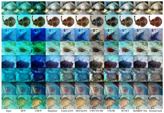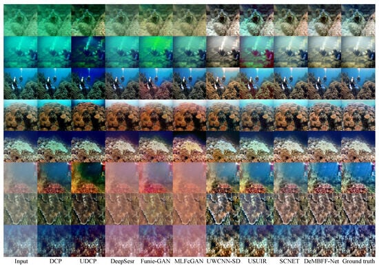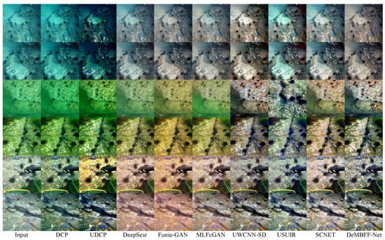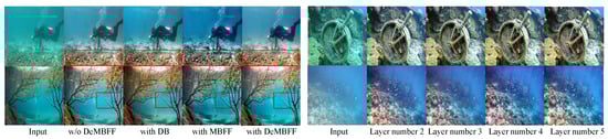 As shown in Figure 10, the results confirm that the DdMBFF mechanism can significantly reduce color bias and blurring in underwater images. It is obvious that the original underwater image in the first column contains multiple degradation phenomena: both color bias and blurring problems. The base network model with DB, shown in the third column, can somewhat reduce the blurring problem. However, some areas still lack detailed restoration (as indicated by the red box). In contrast, the model with MBFF (the fourth column) promotes the details when compared to the model with DB. The full model (with DeMBFF) has a balance between color bias and sharpness in the underwater images and effectively restores the details. The results validate that our approach maintains the most valuable information for enhancement through feature fusion.