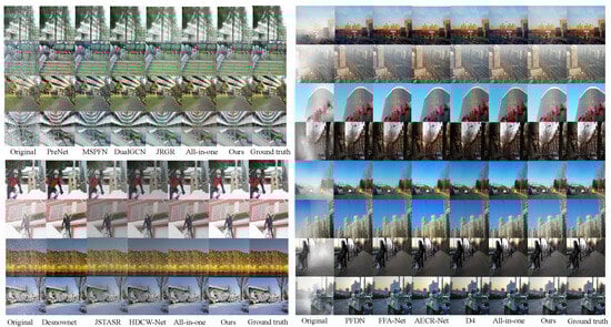 After applying the student model after knowledge distillation to enhance the three different types of degraded images, namely, rainy, snowy, and hazy images, we conducted a thorough visual performance evaluation to assess the qualitative improvement achieved. Figure 11 illustrates the restored results for three types of images, including rainy images (top left), snowy images (bottom left), and hazy images (right). The four teacher models were first trained on four datasets separately. Then, the student model was retrained on the mixed dataset (detailed in Section 5.4).