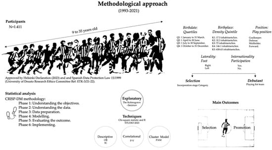 The objective of this study was to detect, among the individual (i.e., innate), acquired and contextual factors of the players: variables that were associated with promotion to the professional team. This knowledge depended on data made available by the club, which are listed in Table 1. A methodological approach called the Cross Industry Standard Process for Data Mining (CRISP-DM) [] was proposed, which consisted of a process of data collection, transformation, cleaning, and standardisation that allowed for successive phases ranging from analytical exploration to the construction of a statistical model. Frequency analysis, correlations, and cluster analysis were developed. The results showed that place of birth and age were key variables in the selection and promotion phases of the players. In addition, it was observed that debut was related to the stage of incorporation and internationalisation and, finally, that place of birth and laterality converged as classifying elements of the players.