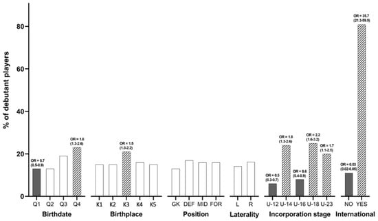 Percentage of debutant players according to variables (OR–IC).