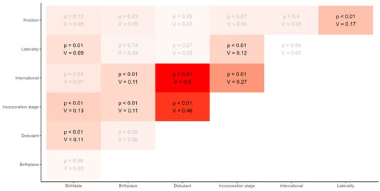In the second group of correlations, internationality, and stage of incorporation (p < 0.01, V = 0.27, regular), position and laterality (p < 0.01, V = 0.17, not very strong), stage of incorporation and place of birth (p < 0.01, V = 0.13, weak), and debutant and place of birth (p < 0.01, V = 0.12, weak) stood out.