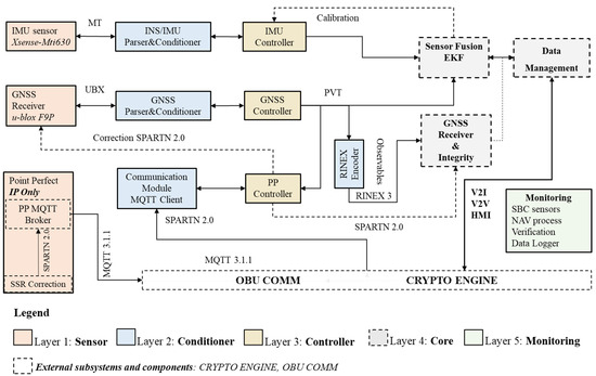 The proposed blocks or components in each layer are intended to provide the required functionalities of the OBU. The first element to guarantee is connectivity (“always connected”). The OBU COMM and CRYPTO ENGINE blocks are external subsystems ensuring remote communication and IP-based services access. The system uses the connection to receive information from the Augmentation GNSS (AGNSS) systems and exchange information with traffic control elements: control centres, other vehicles, or early alert systems. The system proposes solutions based on loosely coupled integration between the inertial sensor measurements and the previously corrected GNSS navigation solutions. The modules involved in the navigation process are dedicated to decoding the information coming from the sensors, managing the information flows and synchronisation. The main objective is to integrate or fuse all useful navigation information to achieve higher levels of accuracy and integrity.