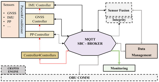 Figure 2 presents a detailed view of exchanging messages via the MQTT broker (Identified as “SBC BROKER”). The arrowheads on the individual connections show whether it is only a subscriber, publishes and subscribes, or only publishes messages through the Broker. For instance, given its observation functionality, the Monitoring block only intends to receive messages and not publish them. Sensors and services publish correctly decoded measured/acquired data in a dedicated Topic, from where they are accessible to the processes or modules that process them. The Controller4Controllers module is responsible for configuring, calibrating and synchronising the sensors and coding/decoding SW components. The Broker is also involved in the external communication process via the OBU COMM module. After the appropriate encryption process, the information to be transmitted to the control centre is made available in a dedicated Topic managed by the Data Management element.