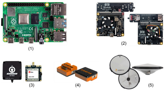 OBU HW components: (1) Onboard Computer Raspberry Pi 4 Model B; (2) Sixfab Power Management; UPS HAT power backup system; (3) Drotek (SIRIUS RTK GNSS ROVER: F9P) with u–blox ZED-F9P chip; (4) Xsens MTi630 AHRS Inertial Sensor; (5) Septentrio Polant–x MF antenna.