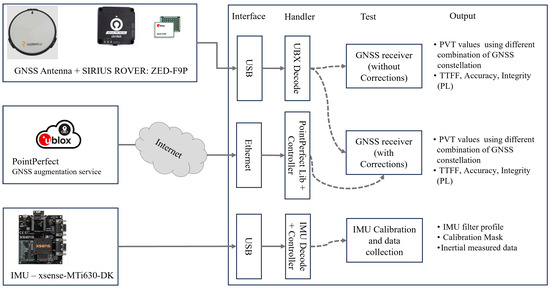 The inertial sensor component used is the Xsens-MTi-630 AHRS (Attitude and Heading Reference System) [24], which contains a 3-axis gyroscope, a 3-axis accelerometer, a 3-axis barometer magnetometer, a high-precision oscillator and a low-power microcontroller unit (MCU). The MCU applies calibration models (unique to each sensor and including orientation, gain and polarisation offsets, plus more advanced relationships such as non-linear temperature effects and other higher order terms) and runs Xsens’ optimised strap-down algorithm, which performs high-speed dead-reckoning calculations up to 2 kHz, enabling accurate capture of high-frequency motions and compensation for coning and sculling. The MTi-600’s output data is easily configured and customised according to the application’s requirements and can be set to use one of several inertial navigation filter profiles [25]. In particular, the MTi-630 AHRS device enhances the process of determining referenced magnetic north and 3D acceleration, velocity and heading calibration data. The project requirements motivating the use of this sensor are low in-run bias stability (accelerometer: 10 (x,y) and 15 (z) [micro-g]; gyroscope: 8 [deg/h]), low noise density (accelerometers: 60 [micro-g/sqrt(Hz)]) and the ability to output data at a sufficiently high frequency for the sensor fusion process. Successive models of the MTi-600 family (i.e., MTi-670/80) support the INS/GNSS integration process internally; in our case, they do not; therefore, the INS/GNSS synchronisation and integration process is performed by SW.