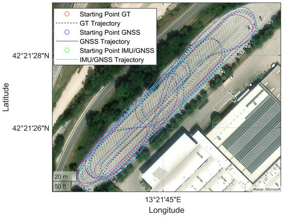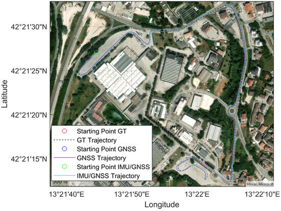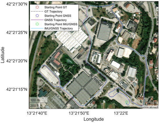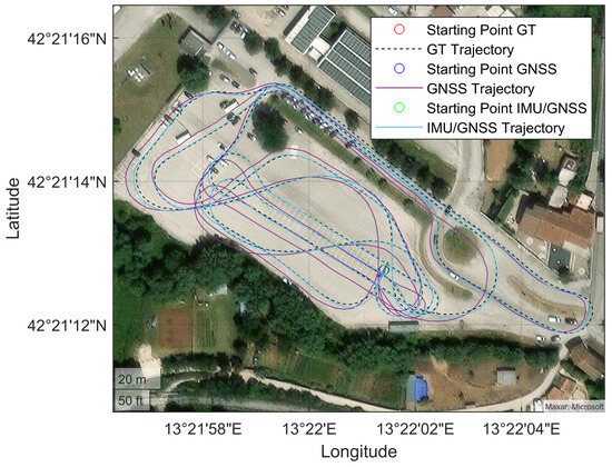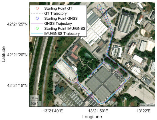 The tests were carried out in a confined area. To simplify the spatial representation in this local context, the North East Down (NED) coordinate frame was chosen. Consequently, the position of the OBU is represented using geodetic coordinates: latitude , longitude , and ellipsoidal altitude . The Earth-referenced velocity is resolved in the local navigation axis to give , and the attitude is expressed as the body-to-local navigation frame coordinate transformation matrix . Here, e denotes the Earth-Centered Earth-Fixed (ECEF) reference frame, n is the NED frame, and b represents the inertial platform “body” coordinate frame.